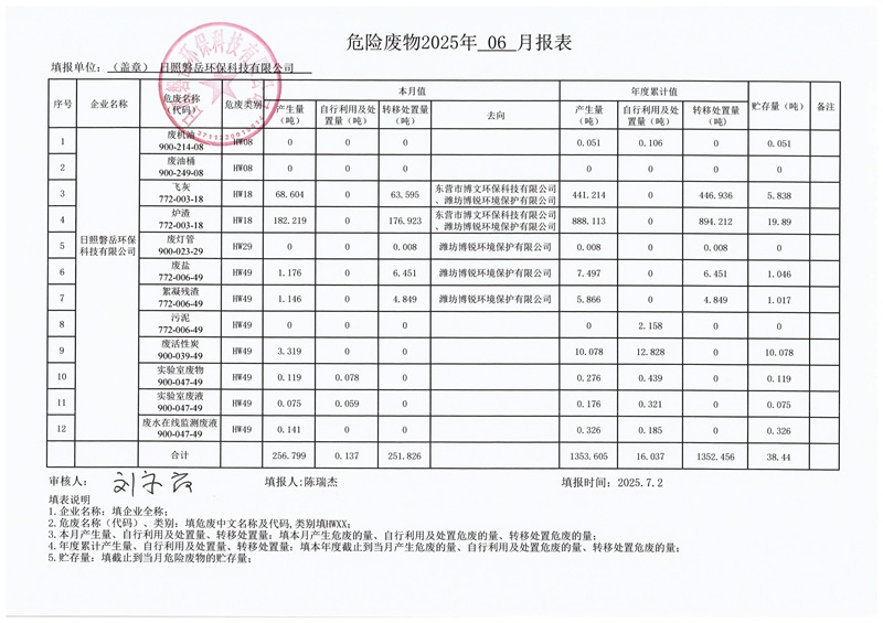 危险废物产生2025年6月份报表|日照磐岳环保科技有限公司-j9九游会入口