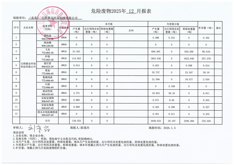 日照磐岳环保科技有限公司危险废物产生2025年12月份报表|日照磐岳环保科技有限公司-j9九游会入口